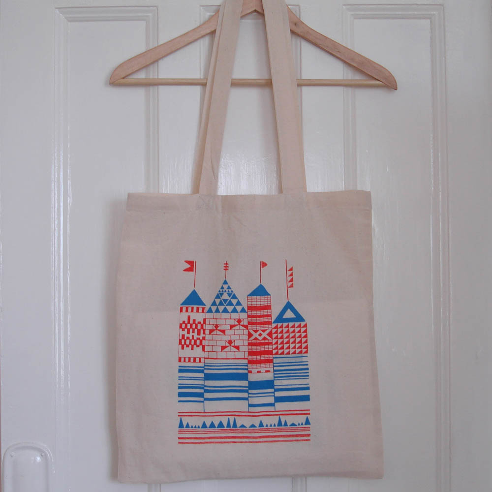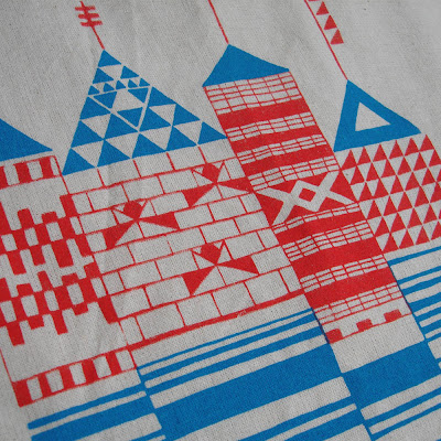 Lately, I've been getting a lot of requests to print my designs on tote bags and here it is! This is the first of many to follow. I've started out with the "Tiny Towers" design. Silkscreen printed by hand on a Long Handle Large Cotton Bag measuring 38cm x 42cm. Handles measure 72cm end to end so hang at about 35cms from the shoulder. The Simple Eco Cotton bag is reusable, so perfect for your grocery shopping or trips to the library or post office.